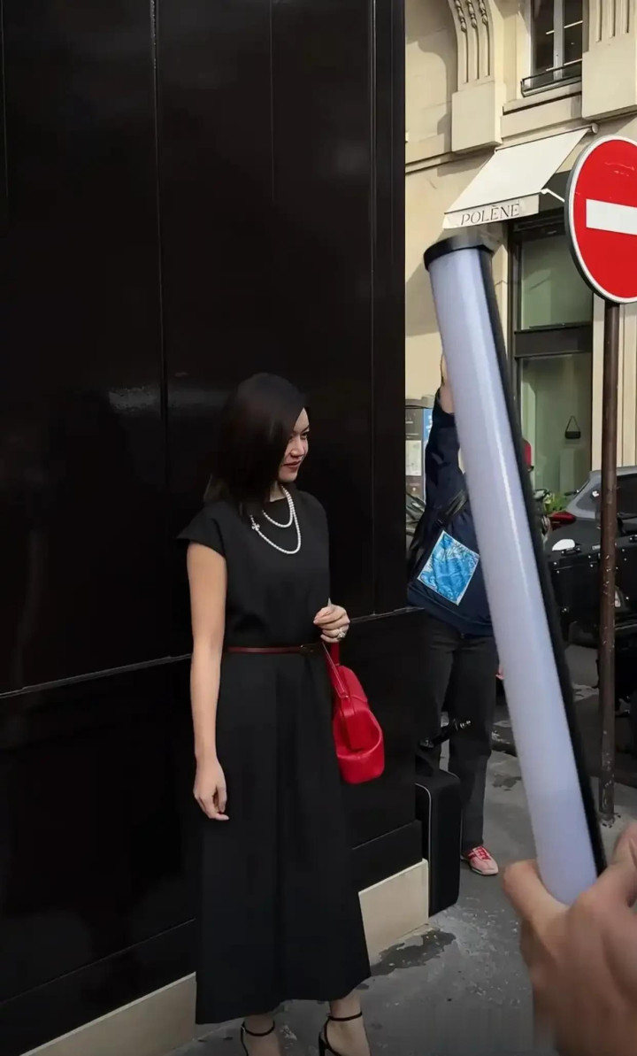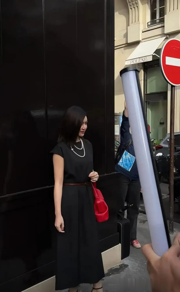 > 42岁的陈妍希时装周造型巨美, 黑色连衣裙搭红色包包腰带, 真年轻